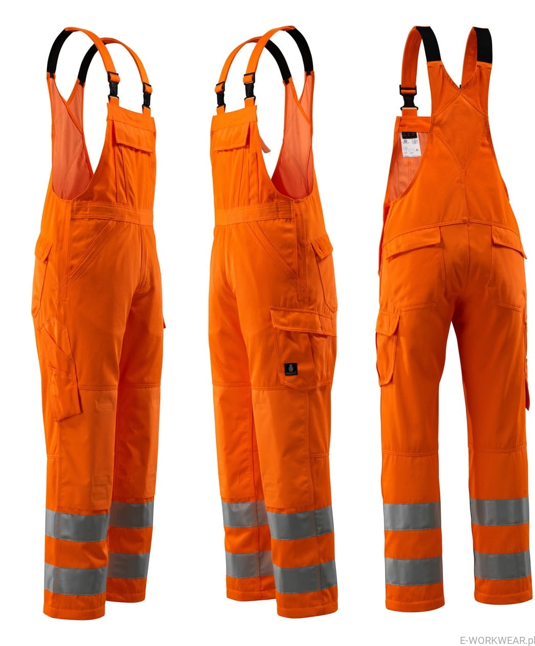 Fluorescencyjny z odblaskami. Teflon® sprawia, że produkt jest odporny na brud. Potrójne szwy w nogawkach i kroku. Nogawki w ergonomicznym kształcie. Regulowane szelki z krótkimi, mocnymi gumkami i plastikowymi klamrami. Kieszeń na klatce piersiowej z otworem na długopis, kieszonką na telefon oraz klapką z ukrytymi zatrzaskami. Regulacja w talii. Rozporek zapinany na zamek błyskawiczny. Zawieszka na klucze. Przednie kieszenie. Tylne kieszenie z klapką. Kieszeń na udzie z klapką i zapięciem na ukryte zatrzaski. Kieszeń na calówkę z wzmocnionym wejściem. Regulowane kieszenie na kolanach z poliestru.