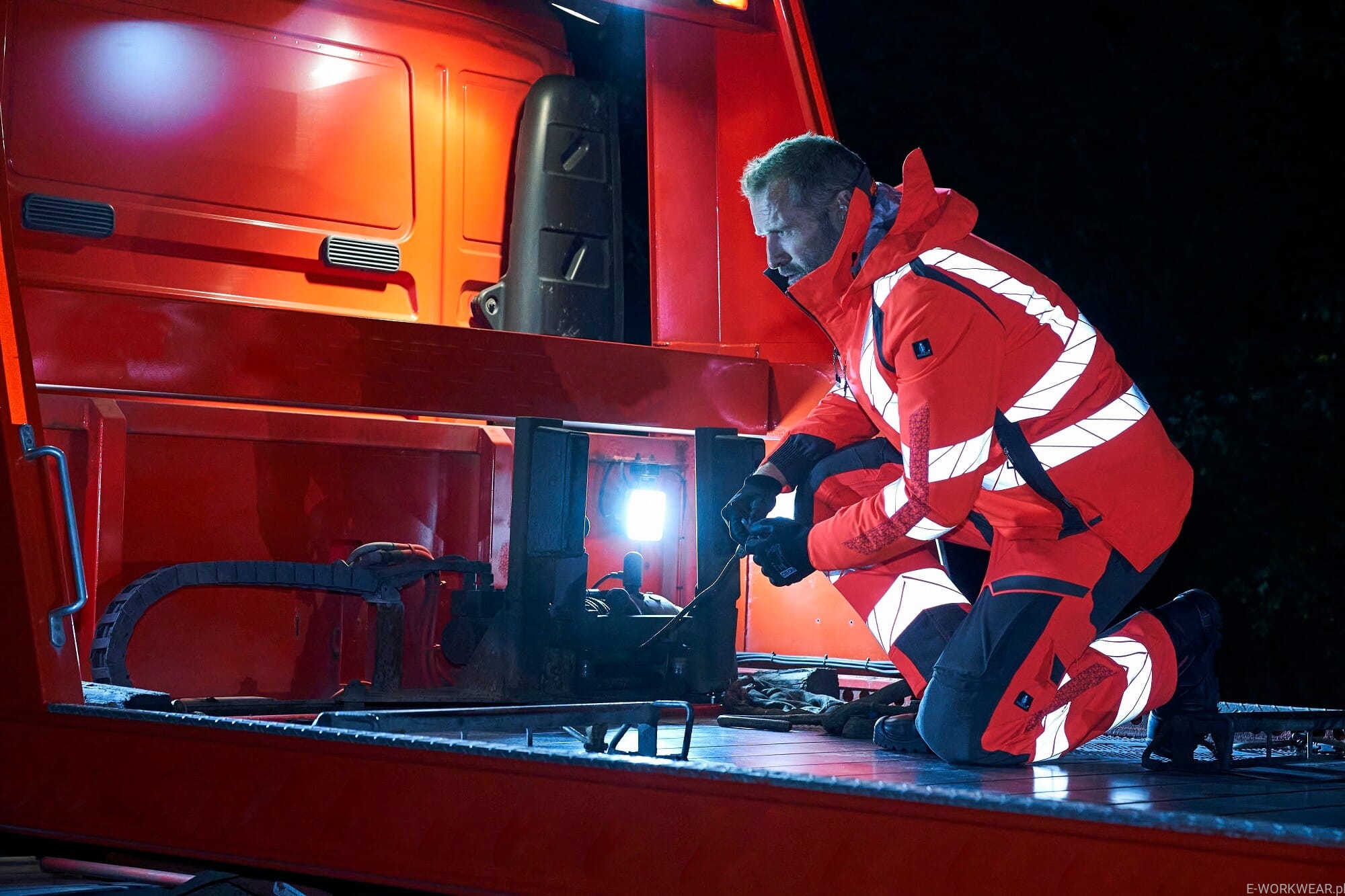 Fluorescencyjny z odblaskami. Wodoodporne wykończenie. Dwukolorowy. Nadzwyczajnie elastyczny, lekki i trwały. Podwójne szwy w nogawkach i w kroku. Obniżona talia. Ukryte zapięcie na zatrzask. Nogawki w ergonomicznym kształcie. Szlufki do paska. Rozporek zapinany na zamek błyskawiczny. Przednie kieszenie. Wzmocnione tylne kieszenie. Ukryta szlufka na młotek po prawej stronie. Możliwość zastosowania kieszeni wiszących 19450-126 dopinanych za pomocą guzików. Kieszeń na calówkę ze wzmocnieniami Kevlar®. Kieszenie z klapkami z przodu ud. Kieszenie na kolanach z supertrwałego materiału CORDURA® (1000 D) są regulowane. Łatwa, indywidualna regulacja wysokości kieszeni na kolanach. Kieszeń na udzie z kieszonką na telefon (z podszewką), ukrytym zapięciem na zatrzaski i zintegrowanym uchwytem na identyfikator. Odczepiany uchwyt na identyfikator. Pionowy zamek błyskawiczny umożliwiający wentylację tylnej części ud. Z możliwością nadruku. Nogawkę można wydłużyć o 3 cm poprzez usuniecie wewnętrznego, czerwonego szwu. Do tego modelu polecamy wkładki ochronne na kolana 00718-100, 00418-100, 50454-916 & 20118-915. Certyfikowane do użytku z wkładkami ochronnymi typu SHORT lub LONG, zgodnie z normą EN 14404.