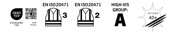 Dzianina.Kurczliwość maks. 5%.Zgodnie z normą EN ISO 20471 produkt zachowa swoje właściwości po 50-krotnym praniu domowym.