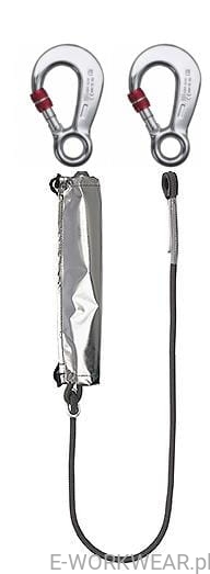 Odporny na działanie płomieni amortyzator bezpieczeństwa z regulowaną linką. Amortyzator wykonany jest z taśmy polimaidowej jest zabezpieczony dodatkowo rękawem ochronnym wykonanym z tkaniny aluminizowanej.