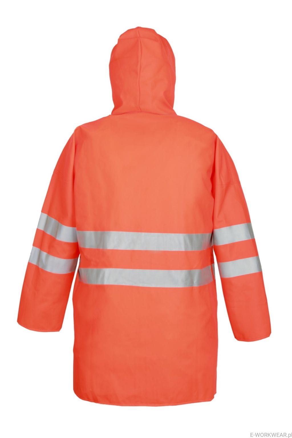 Kurtka zapinana na napy, z kapturem i dwiema bocznymi kieszeniami przykrytymi patkami. Posiada taśmę ostrzegawczą zwiększającą widzialność pracownika. Model produkowany z wodoochronnej tkaniny Plavitex Fluo, przeznaczony do użytku w niesprzyjających warunkach pogodowych, kiedy widoczność jest ograniczona. Zapewnia skuteczną ochronę przed wiatrem i deszczem. Technika obustronnego zgrzewania zwiększa wytrzymałość szwów. Produkt spełnia standardy europejskich norm: EN ISO 13688, EN 343 i EN ISO 20471.
