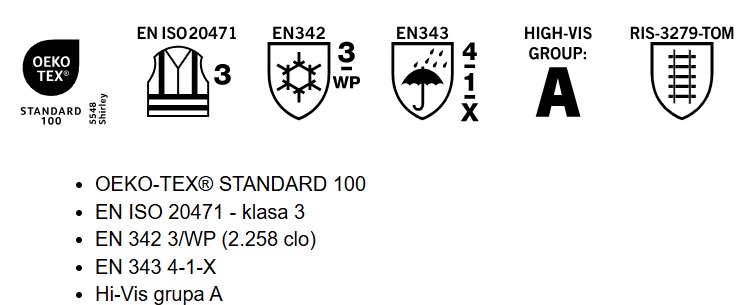 Fluorescencyjny z pionowymi, ukośnymi i krzyżującymi się odblaskami. Tkanina o wysokiej wytrzymałości, oddychająca, wiatro- i wodoszczelna. CLIMASCOT® Lightweight Insulation. Podklejane szwy. Odpinany kaptur z podszewką, z regulacją na gumkę. Zapięcie na zamek błyskawiczny i podwójna klapka sztormowa. Wewnętrzna kieszeń - dwie zapinane na zamek błyskawiczny, jedna otwarta, z siateczki. Odczepiany uchwyt na identyfikator. Kieszeń na piersi zapinana na zamek błyskawiczny. Przednie kieszenie zapinane na zamek błyskawiczny. Wysoki kołnierz. Wewnętrzny ściągacz wzdłuż dolnej krawędzi przodu kurtki. Materiał w dolnej części pleców można wydłużyć odpinając guziki i dzięki temu uzyskać dodatkową ochronę przeciw wiatrowi i złej pogodzie. Ściągacz (ukryty w klapce sztormowej) w mankietach. Zapięcie na rzepy przy mankietach. Wewnętrzny zamek błyskawiczny w dolnej części pleców stosowany jest przy umieszczaniu haftu lub nadruku.