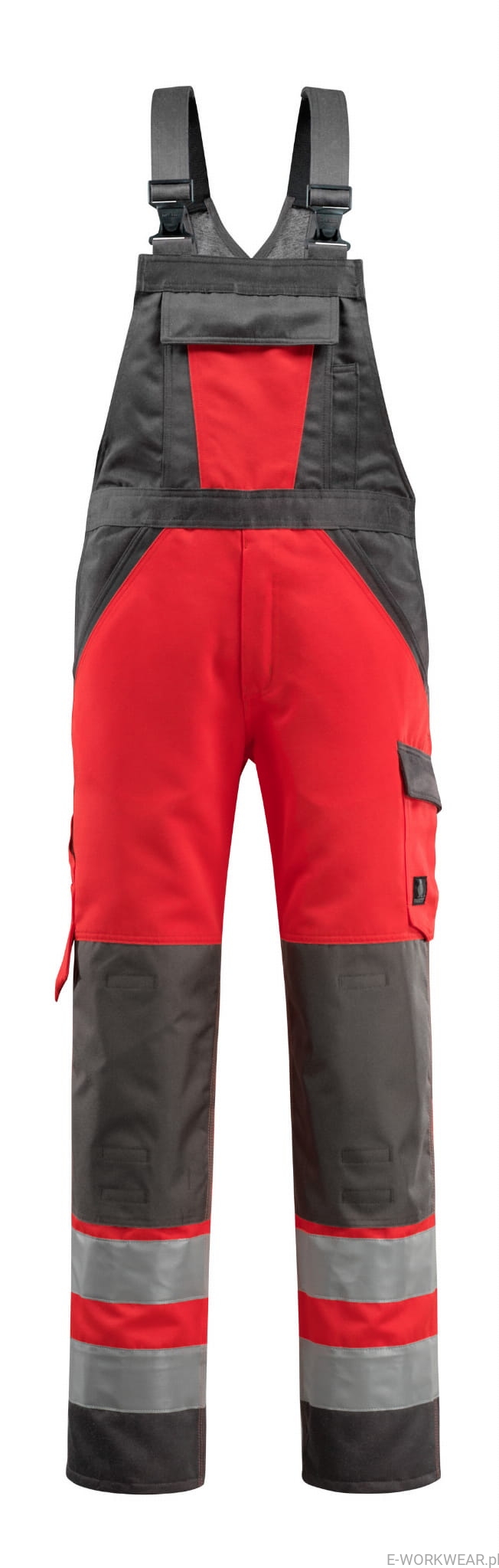 Fluorescencyjny z odblaskami. Dwukolorowy. Potrójne szwy w nogawkach i kroku. Nogawki w ergonomicznym kształcie. Regulowane szelki z krótkimi, mocnymi gumkami i plastikowymi klamrami. Kieszeń w klapie z klapką i otworem na długopis, zapinana na ukryte zatrzaski. Regulacja w talii. Rozporek zapinany na zamek błyskawiczny. Zawieszka na klucze. Przednie kieszenie. Tylne kieszenie z klapką. Kieszeń na udzie z klapką i zapięciem na ukryte zatrzaski. Kieszeń na calówkę z wzmocnionym wejściem. Regulowane kieszenie na kolanach z poliestru.