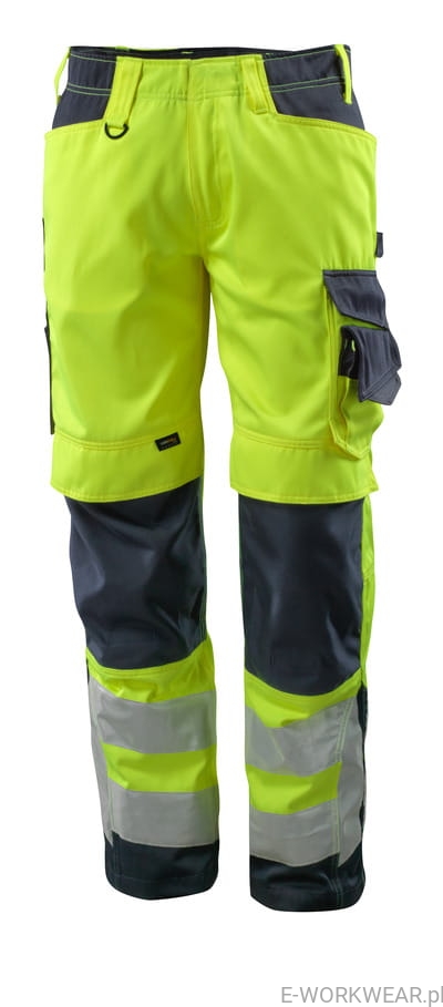 Fluorescencyjny z odblaskami. Dwukolorowy. Teflon® sprawia, że produkt jest odporny na brud. Potrójne szwy w nogawkach i kroku. Obniżona, dopasowana talia. Nogawki w ergonomicznym kształcie. Szlufki do paska. Rozporek zapinany na zamek błyskawiczny. Zawieszka na klucze. Przednie kieszenie. Wzmocnione tylne kieszenie z klapką, zapinane na ukryte zatrzaski. Regulowana pętla na młotek. Wzmocniona kieszeń na udzie posiadająca dodatkowe kieszenie - wewnętrzna kieszeń na telefon i zewnętrzna kieszeń na telefon z klapką i zamknięciem na magnes. Kieszeń na calówkę z wejściem wzmocnionym materiałem CORDURA. Wykonane z trwałego materiału CORDURA® (500 D) kieszenie na kolanach są regulowane, a ich otwór na wsuwane od góry nakolanniki zabezpieczony jest klapką. Pionowe paski refleksyjne na zewnętrznej stronie nogawek w calu zapewnienia dodatkowej widoczności. Nogawkę można wydłużyć o 3 cm poprzez usuniecie wewnętrznego, czerwonego szwu kolo stopy.