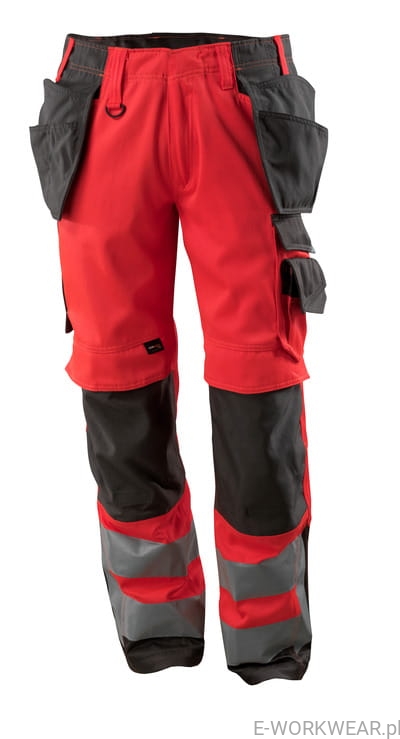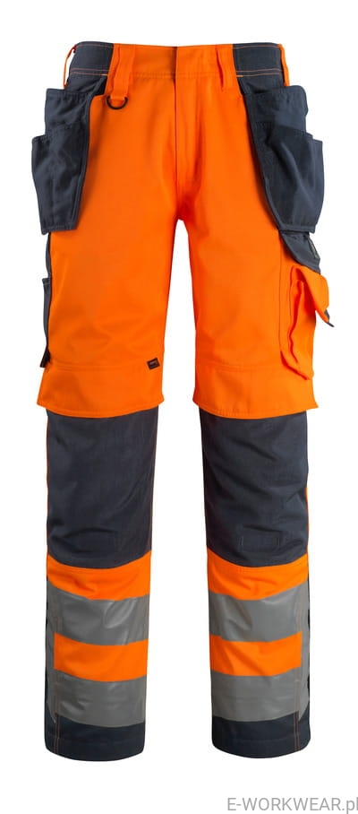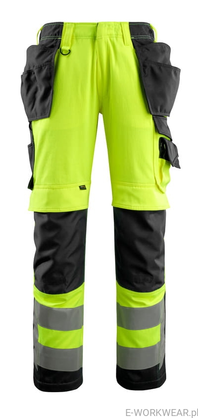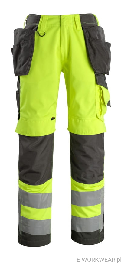 Fluorescencyjny z odblaskami. Dwukolorowy. Teflon® sprawia, że produkt jest odporny na brud. Potrójne szwy w nogawkach i kroku. Obniżona, dopasowana talia. Nogawki w ergonomicznym kształcie. Regulowane kieszenie wiszące z CORDURA® z dodatkowymi kieszonkami na narzędzia. Szlufki do paska. Rozporek zapinany na zamek błyskawiczny. Zawieszka na klucze. Uchwyt na narzędzia w pasie. Przednie kieszenie. Wzmocnione tylne kieszenie z klapką, zapinane na ukryte zatrzaski. Regulowana pętla na młotek. Wzmocniona kieszeń na udzie posiadająca dodatkowe kieszenie - wewnętrzna kieszeń na telefon i zewnętrzna kieszeń na telefon z klapką i zamknięciem na magnes. Kieszeń na calówkę z wejściem wzmocnionym materiałem CORDURA. Wykonane z trwałego materiału CORDURA® (500 D) kieszenie na kolanach są regulowane, a ich otwór na wsuwane od góry nakolanniki zabezpieczony jest klapką. Pionowe paski refleksyjne na zewnętrznej stronie nogawek w calu zapewnienia dodatkowej widoczności. Nogawkę można wydłużyć o 3 cm poprzez usuniecie wewnętrznego, czerwonego szwu kolo stopy.