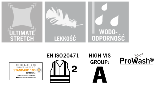 - Dodatkowa widoczność dla otoczenia dzięki zastosowaniu fluorescencyjny z ukośnymi i krzyżującymi się odblaskami.