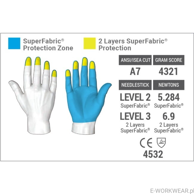 - Najwyższy poziom odporności na przecięcia na zaznaczonych, wzmocnionych obszarach, ANSI / ISEA Cut Level A7 i Needlestick Level 3 na wyciągnięcie ręki