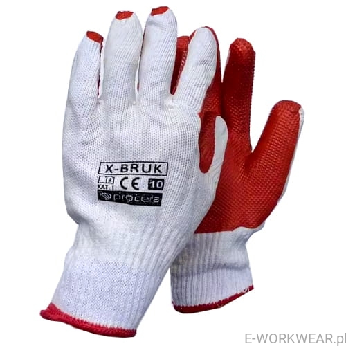 Rękawice robocze z dzianiny X-BRUK, powlekane grubą warstwą gumy w kolorze czerwonym. Bardzo duża odporność na ścieranie, przecieranie i rozdarcie. Idealne do układania kostki brukowej, dla murarzy oraz pracowników budowlanych.