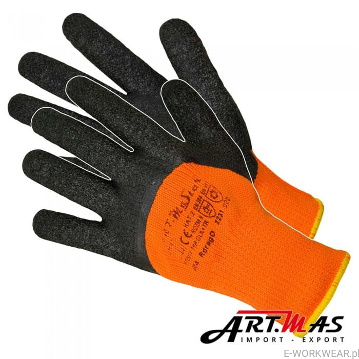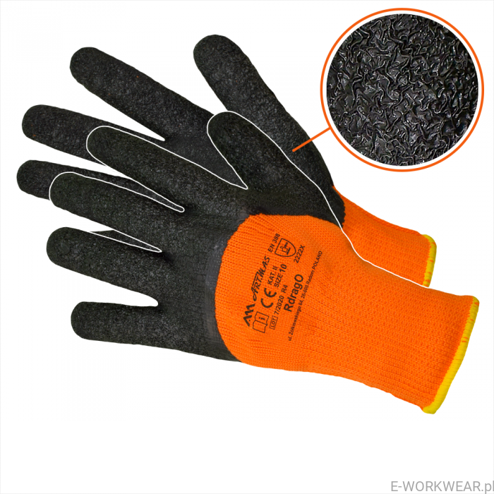 Rękawice robocze, ocieplane dziane bezszwowe w kolorze pomarańczowym fluorescencyjnym, wykonane z akrylowej dzianiny frote (frote od strony wewnętrznej). Powleczone szorstkowanym lateksem w kolorze czarnym, zakończone ściągaczem. Doskonałe do użytku w warunkach zimowych.