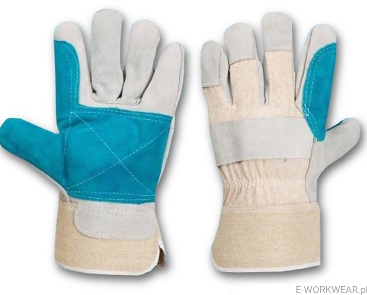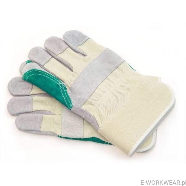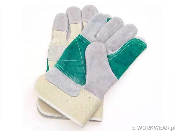 część chwytna dodatkowo wzmocniona jedną warstwą dwoiny bydlęcej w kolorze zielonym na środkowej części dłoni oraz na palcu wskazującym