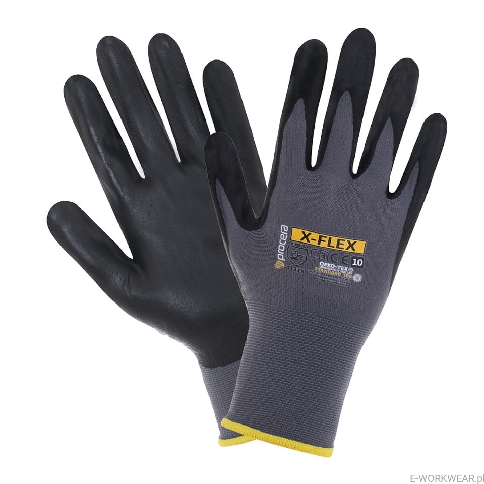 Rękawice ochronne X-FLEX wykonane z nylonu i poliestru z dodatkiem lycry powlekane w części chwytnej spienionym nitrylem. Doskonałe dopasowanie i elastyczność oraz czucie przedmiotów przy jednoczesnym zapewnieniu wysokiej wytrzymałości mechanicznej. Posiadają doskonałe właściwości oddychające oraz certyfikat "OEKO-TEX" Standard 100 potwierdzający brak substancji szkodliwych, dzięki czemu gwarantują wysoki komfort użytkowania.