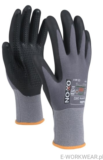 OX-ON Flexible Supreme 1602 to ekskluzywna, niezwykle wygodna, gładka i trwała rękawica o doskonałej zręczności i niesamowitej przyczepności. Niezależnie od tego, czy jest to hydraulik, elektryk, rusztowanie czy pracownik magazynu, Flexible Supreme 1602 to bezkompromisowy wybór rękawic roboczych do pracy zarówno w środowisku mokrym, jak i suchym. Cała dłoń i palce mają powłokę z pianki nitrylowej. Dodatkowo kropki na dłoni zapewniają precyzyjny chwyt. Niezwykle elastyczny, ponieważ wykonany jest z nylonu / elastanu dla idealnego dopasowania. Doskonały do prac szlifierskich lub montażowych, często wybierany przez stolarzy, kamieniarzy, operatorów maszyn itp. Model ten posiada również certyfikat Oeko-Tex, gwarantujący, że nie zawiera niebezpiecznych chemikaliów i barwników.