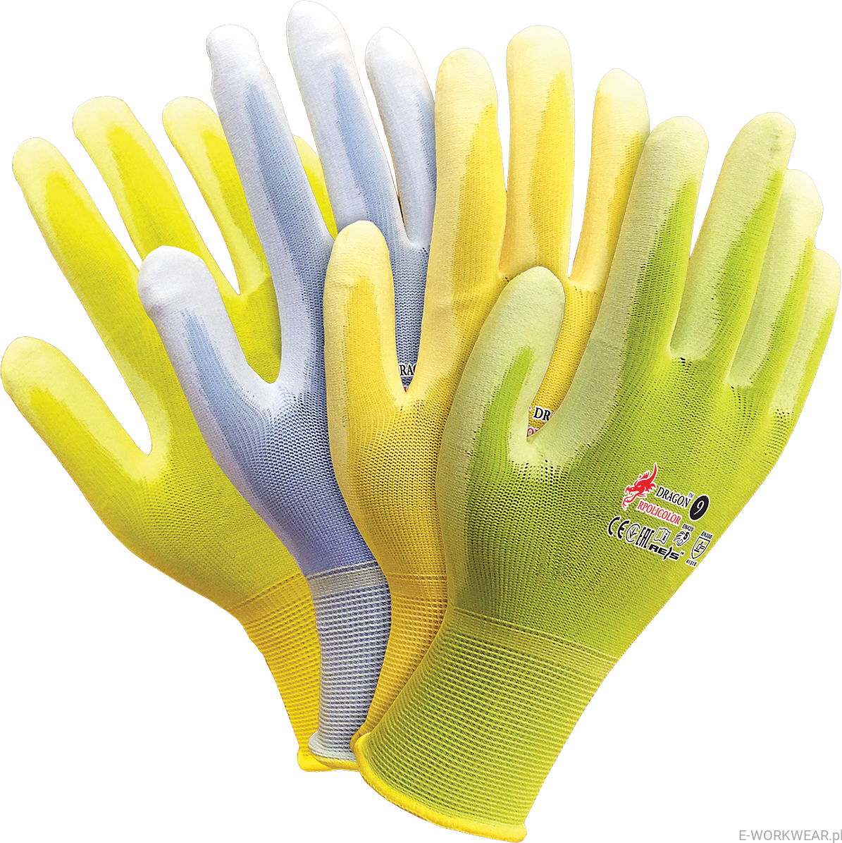 Rękawice ochronne wykonane z nylonu w jaskrawych kolorach.