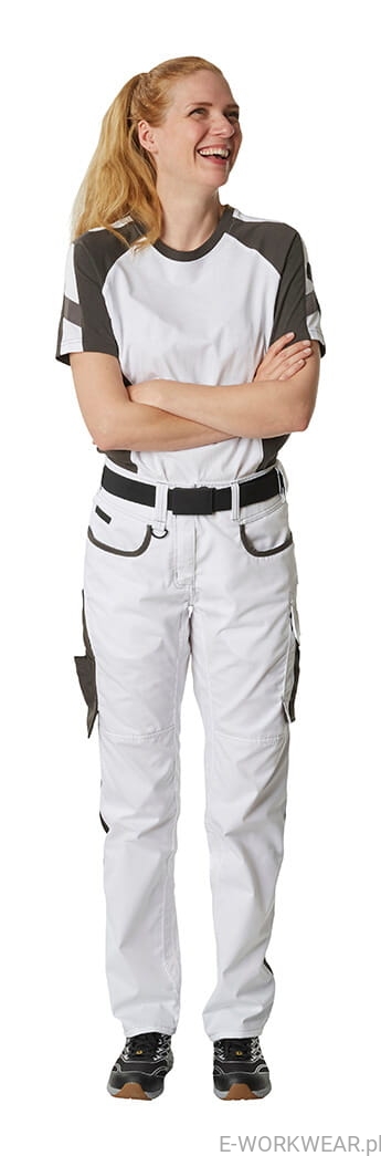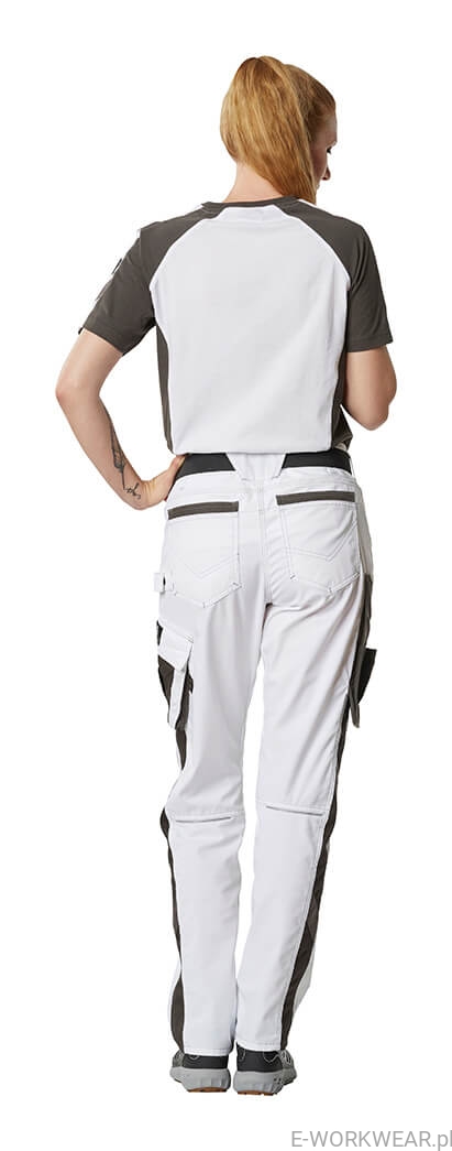 Dwukolorowy. Damski krój Perła. Lekka tkanina. Potrójne szwy w nogawkach i kroku. Obniżona, dopasowana talia. Nogawki w ergonomicznym kształcie. Szlufki do paska. Zawieszka na klucze. Zapięcie na zamek błyskawiczny. Uchwyt na narzędzia w pasie. Obszerne przednie kieszenie wzmocnione Cordurą ® - jedna z wewnętrzną łatwo dostępną kieszonką na telefon. Wzmocnione tylne kieszenie. Regulowana pętla na młotek. Kieszeń na udzie z klapką i kieszonką na telefon, zapinana na ukryte zatrzaski. Wzmocniona tkaniną CORDURA® kieszeń na calówkę. Kieszeń na długopis. Tył produktu, w miejscach gdzie znajdują się tylna kieszeń, kieszeń udowa oraz kieszeń na calówkę, został wzmocniony dodatkową warstwą materiału. Odblaski.