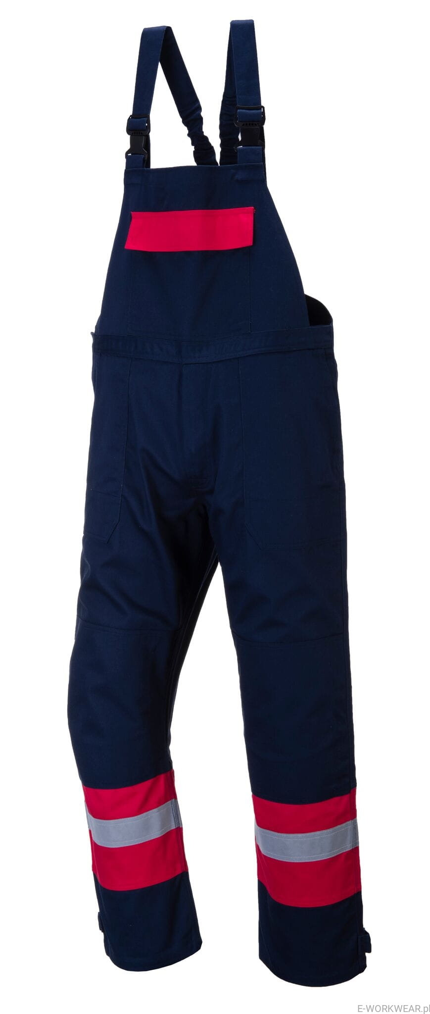 Spodnie ogrodniczki FR57 trudnopalne, antyelektrostatyczne z taśmą odblaskową przyszytą podwójnym ściegiem i podwyższającą widoczność pracownika. Zapinane na mosiężny zamek błyskawiczny. Posiadają kieszenie na nakolanniki i na linijkę. Kieszeń na klatce piersiowej. Potrójne szwy. Na końcach nogawek zastosowano regulację.