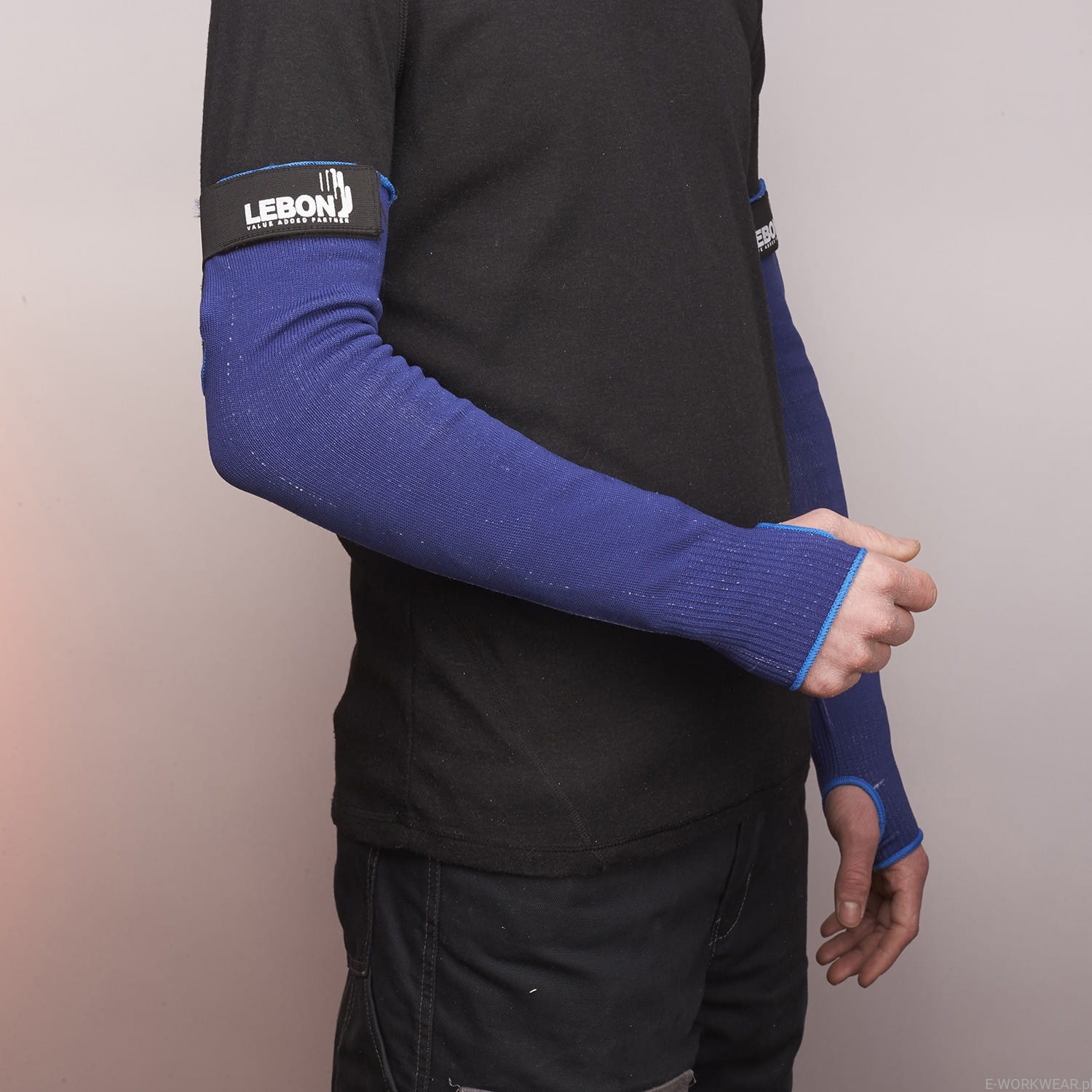 Naramiennik ochronny LEBON 45H wykonany z włókien o wysokiej wytrzymałości, elastanu oraz 100% teksturowanego, niebieskiego poliamidu. Zapięcie na rzep dla zapewnienia komfortu.